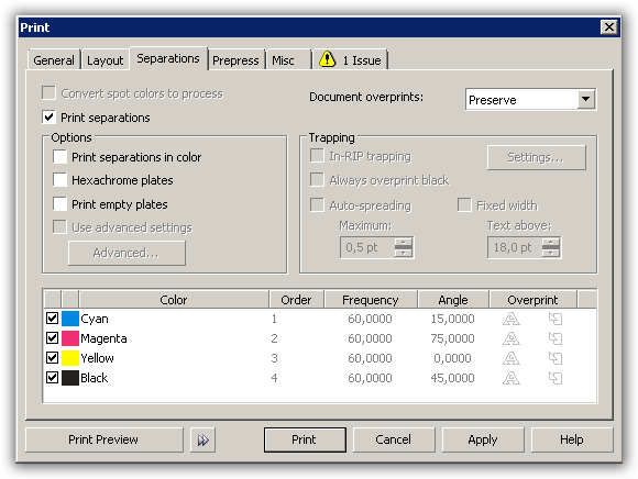 6. Untuk pengaturan printernya berbeda dengan ketika ngeprint kertas biasa. Setelah kertas output diatur sedemikian rupa, pada tab Separations aktifkan Print Separations dengan mencentangnya. Lihat pada bagian bawah, di sana terlihat masing-masing warna seperti gambar di bawah ini: