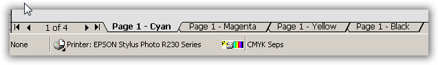 7. Selanjutnya, jangan diprint dulu. Klik Print Previewnya terlebih dahulu. Jika pengaturannya benar maka di sana akan ada 4 tab warna CMYK. Yang artinya, ketika anda klik print maka akan ngeprint 4 lembar kertas. Setelah anda yakin benar barulah mulai diprint. lihat gambar di bawah ini: